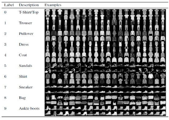In this paper, three well-known open image databases with atypical visual characteristics were considered for training in, and inferring of, personal visual preferences: Fashion-MINIST, LFW, and Indoor Scene Recognition [16,17,18]. Fashion-MNIST is an image dataset of fashion products, which is made up of 60,000 training images and 10,000 test samples including 10 categories of 28 × 28 grayscale images [6,16]. Figure 4 shows 10 class labels from Fashion-MNIST and some images sampled in Fashion-MNIST.