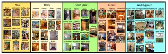 - Quattoni, A.; Torralba, A. Recognizing indoor scenes. In Proceedings of the 2009 IEEE Conference on Computer Vision and Pattern Recognition, Miami, FL, USA, 20–25 June 2009; pp. 413–420. [Google Scholar]