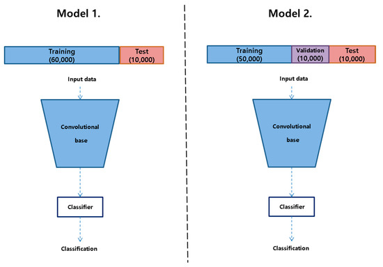 We considered two different models. Model 1 was trained and tested using only a training dataset and a test dataset. Model 2 utilized a validation dataset as well as training and test datasets. In the experiments for measuring classification performance of the proposed preference inference model using the Fashion-MNIST database, Model 1 used 60,000 training images and 10,000 test images. However, for Model 2, training was conducted with 50,000 training images, 10,000 validation images, and 10,000 test images, as shown in Figure 7. Table 2 shows the preference classification results for Model 1 and Model 2 with the Fashion-MNIST dataset.