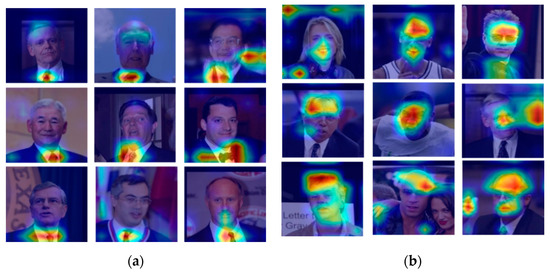 Visual expressions applying Grad-CAM for user preference–classification results with LFW: (a) sample heat maps for the results in preferred data, and (b) sample heat maps for the results in non-preferred data.
