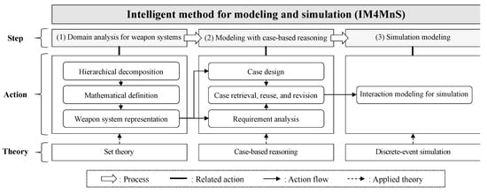 Each step includes one or more actions and flows among them to accomplish the goal, while explaining a modeling and simulation process; the theory enabling each step is applied to support the corresponding step. The first step of IM4MnS hierarchically decomposes the existing weapon systems and their models, and it then deduces the common structures and constituents. The results are defined mathematically using the set theory and are used to re-express the weapon systems or models; the outcome of the first step is reflected in the next step. The second step designs cases based on the analyzed structures of weapon systems, and it also designs CBR processes for the retrieval, reuse, and revision to utilize the designed cases. Through this process, the required models are designed and then reflected in the simulation modeling. The last step produces interaction models between the designed model and its given circumstances, such as the operational environments and engagement situations. The interaction models are evaluated using simulations.