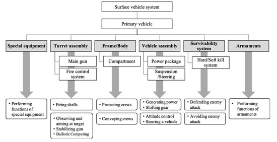 It is necessary to identify the structural and functional properties of the actual weapon system because formalizing the properties and constraints enables the simple automation of the reusing and modeling process. The present authors referred to a handbook of work breakdown structure (WBS) of the US Department of Defense (DoD) [], which provides a manual for the hierarchical structures of various weapon systems, in an attempt to establish the structural characteristics and procedural systemicity. Here, the WBS can be employed to analyze a whole system with its subsystems and relationships among the system constituents. In particular, the function of a weapon system can be elicited through this structure. Figure 2 illustrates an example of the functional properties deduced from the hierarchical structure of a surface vehicle system based on WBS. The surface vehicle system roughly consists of six parts, such as “Special equipment”, “Turret assembly”, “Frame/Body”, “Vehicle assembly”, “Survivability system”, and “Armaments”. In addition, the assembly part can be divided into sub-components.