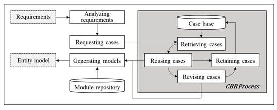As an alternative, CBR, which is a paradigm of artificial intelligence mimicking the human problem-solving process, can be used to deduce solutions based on previous cases that are similar to the requirements []. The characteristics of CBR enable its broad application in system development in various fields such as planning, classification, diagnosis, and design []. Specifically, we analyzed the related works on the modeling methods to assemble the formalized constituents using CBR. The authors of [] tried to automate the design of weapon system models by configuring modules using CBR to advance the work of []. The authors of [] proposed the generation of a bill of materials (BOM) to customize a product to satisfy customer requirements by using the CBR algorithm. Similarly, the authors of [] proposed a system to design the variants of a product for customization based on extended conventional BOM and CBR. The studies mentioned above confirm that the design using CBR requires structural analysis of the object; based on this, it can offer practical solutions that are tailored to the specific purposes.