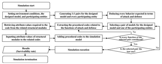 The given environment and the interaction of attack and defense between the participating entities can be utilized not only to analyze requirements for modeling but also to simulate the design to confirm the validation. The simulation model for the interaction is designed to produce various results for the success of attack and defense under the same conditions from the perspective of probability. Figure 5 illustrates the simulation process of the interaction model.