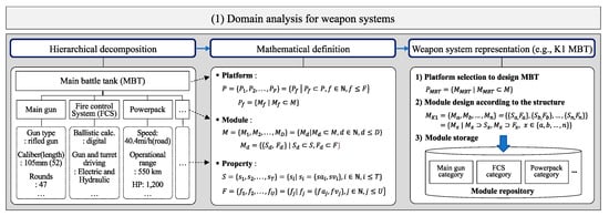 All structural and functional properties can be defined in the form of a set ; . The subscripts and denote the number of elements in each set; and are structural and functional attributes and values, respectively. The binary relation () from () to () is a subset of . signifies the connection of the structural properties with the related functional properties and can be defined as Similarly, a module is formed by the configuration of the selected structural and functional properties. The module, which is represented in , is expressed as The entire set that contains the module is defined as . The subscript indicates the number of elements of the set . A platform to model a weapon system consists of a subset of the entire module set, and is defined as . In addition, the set of all platforms is expressed as , and they are classified according to their types. A weapon system comprises a subset of the entire platform set, and is defined as .