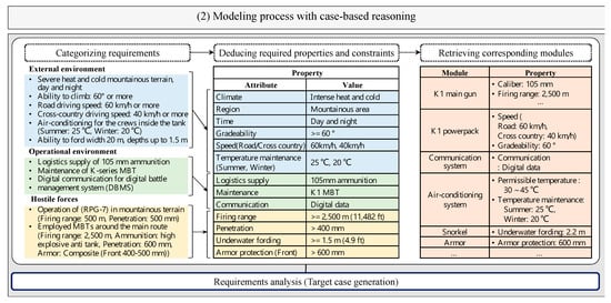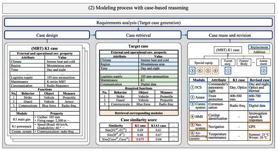 Modeling a weapon system is possible through a combination of the designed modules. However, an increase in the number of modules composing a model increases the factors that the designers need to consider for modeling, and it also hinders the designers from guaranteeing consistent quality for the same object modeling []. Therefore, the design of an intelligent modeling process that systematically considers the related factors is required. Prior to the process design, considering the feature whereby weapon systems in the same category share a common structure and are slightly different from each other, a modeling method that partially modifies an existing model according to the requirements is considered. From this perspective, the concept of CBR can be utilized, and Figure 4 explains the overall process of systematic modeling using CBR. Since the important point is the actualization of the CBR process, which enables the generation of design specifications, the present authors attempted to design the sub-processes in detail to realize each process of CBR. The overall process consists of four steps: Analyzing requirements, retrieving similar cases from the case base, reusing or revising the cases, and retaining the cases [,].