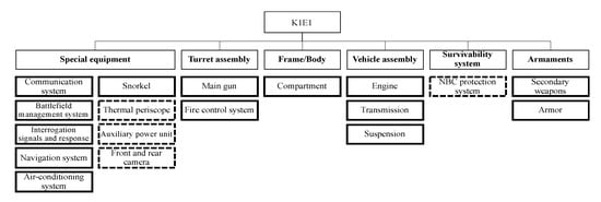 To confirm the practicality of the modeling result, the present authors tried to compare the designed model with the real tank case having similar structures and functions. For comparison, the K1E1 tank was selected as the real reference model. This MBT is an improved version of the old K1 tank, which corresponds to the requirements of future warfare, enabling the combined operation with a new K2 tank. From this perspective, the aspect of improved model design based on the existing design is consistent with the purpose of this study. Thus, the K1E1 case was used as the reference model. The K1E1 tank is re-expressed with the configuration of modules, and then it is compared with the configuring modules of the revised case. The construction of the K1E1 tank is shown in Figure 9, where the rectangle in the bold line is the module shared in both K1E1 and the revised case, and the rectangle in the dotted line is the additional module mounted on the K1E1 tank. The designed model in Section 4.1 shares many of the common features with the K1E1 tank illustrated in Figure 9 (14/18 = 0.78 based on K1E1), and the designed model is realistic because the development of the K1E1 tank is completed, and the implementation of the performance improvement project has been planned from 2021 to 2038 according to a press release [].
