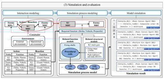This work devises a simulation model to test the response capability of the designed weapon system against expected enemy threats. This simulation is utilized to confirm whether the designed model can survive in a given situation through repetitive interactions between combatant entities in terms of attack and defense. The modeling process of the interactions is presented in the first part of Figure 10. The generation of procedural codes for each function based on functional and structural modules, and a simulation procedure modeling using the codes can be observed in the second part of the illustration below. Each procedural code that constitutes this model is executed using a simulation engine, which enables the results of the interactions between the model and the objects to be identified. This confirms that it is possible to provide a testable simulation using the method proposed in this paper, which is among the expected benefits mentioned in the introduction.