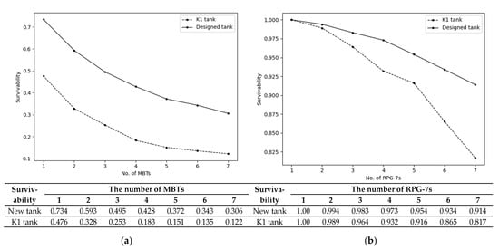 Tables showing the survivability of K1 and the new tanks with increasing number of enemy anti-tank guns and MBTs (a) Survivability of K1 tank model (b) Survivability of the new tank model.