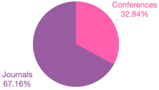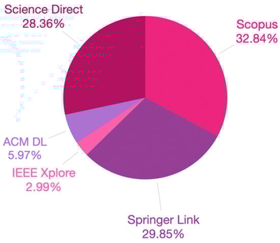 Figure 2 shows the percentage of articles available in each of the databases consulted. We can observe that the largest number of articles was found in the Scopus (32.84% of 67) followed by Springer Link (29.85% of 67), and Science Direct (28.36% of 67) databases. The lowest number was found in ACM DL (5.97% of 67) and IEEE Xplore (2.99% of 67) databases.