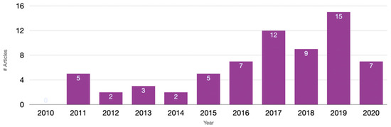 The 67 selected articles were published within a period of 10 years, between 2010 and 2020 (until April 2020). Figure 3 shows the number of articles published per year within the 10-year period considered in this review. Seventeen of these articles were published in the first 5 years, whereas 50 articles were published in the latter 5-year period, indicating the considerable increase in scientific interest in studies on CX.