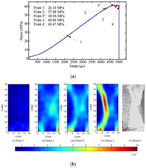 Five specimens are loaded in the experiments. Although the evolution details and forms of DLB of these specimens are different, the law of the structural control is consistent. In order to analyses the characteristics of structural evolution in detail, the result of one of them is shown as follows. Figure 2a shows the stress–strain curve of the rock specimen, and in the x-axis με is the micro-strain. The maximum shear strain fields (points 1, 2, P, and 3 on the stress–strain curve) and failure form at point 4 are shown in Figure 2b. At point 1, the rock is still in the stage of elastic deformation, and the deformation field is almost homogeneous. At point 2, the stress–strain curve becomes non-linear, and strain concentration areas appear in the lower and middle part of the rock specimen. Thereafter, the existing strain concentration areas continue to increase, and develop into two obvious DLBs, shaped as “X” at point P, which is the peak point of the stress–strain curve. In the process of stress adjustment, one DLB can develop into the dominant DLB, while others will slow down or even stop developing. In the deformation localization process, the unbalanced evolution of the DLBs can be explained as the competitive process of forming the DLB. However, the DLB to the left becomes the dominant DLB at point 3, as shown in Figure 2b. Finally, a macro-crack appears at the location of the dominant DLB, and the rock specimen fails at point 4. The above deformation process analysis reveals a considerable difference in the evolution of DLBs before and after the peak stress point (point P). It is worth noting that there may be more than one DLB in the early stage of formation. In the evolution process of DLBs, there is a very strong competition mechanism between them. The competition is positive feedback, that is, when one of the DLBs’ development gains an advantage, the degree of deformation concentration will further strengthen. However, the development of other DLBs will slow down or even stop. This complex competition mechanism leads to the fact that not all DLB locations could show macro-cracks.