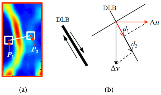 In addition to the deformation fields under different stress levels, different deformation indexes, including the normalized value of deformation field variance S, the dislocation displacements of dominant DLB, and the accumulative AE ringing counts during the loading process, were determined. The variance S of the maximum shear strain field was obtained using the deformation field data, which can be used to describe the non-uniform degree of deformation field [38]. The accumulative AE ringing counts, which can reflect the damage inside the rock specimen, were obtained from the AE signals [39]. Using the deformation field and the failure form of the rock specimen, the location of the dominant DLB can be determined. Two small areas perpendicular to the crack direction at different sides of the dominant DLB were selected, as shown in Figure 3a. Using the DIC method, the relative displacements Δu and Δv of the two center points (P1 and P2) of the small areas in the u and v directions were calculated, respectively. The sum of components d1 and d2 of Δu and Δv along the direction of the dominant DLB were defined as the dislocation displacement [40], and the calculation principle is shown in Figure 3b. Further, the curves of the four deformation indexes are plotted in Figure 4.