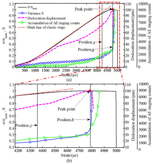 As shown in Figure 4a, before position A, the global mechanical behavior is in the elastic stage. The deformation localization is not significant during the elastic deformation stage, and the accumulative AE ringing counts, variance S and dislocation displacement increase slowly. After position A, the global mechanical behavior of the rock specimen exhibits non-linear evolution. To show the evolution characteristics of different indexes in the non-linear stage clearly, the region of the red dashed line in Figure 4a is magnified and shown in Figure 4b. The με in the x-axis of Figure 4a,b is micro-strain. Figure 4b shows that from position A to position B (the peak stress point) the increase in accumulative AE ringing counts is almost constant. However, the curve of variance S changes direction rapidly and the dislocation displacement increases at a faster rate, reflecting the additional enhancement of deformation localization. The dominant DLB forms at position B. The dominant DLB is the result of micro-crack propagation and connectivity. Therefore, the dominant DLB is equivalent to the “weak interlayer structure” in the rock specimen. It is worth emphasizing that position B marks a turning point at which the dislocation displacement curve changes direction. This phenomenon indicates that the mechanical property of the rock specimen has changed dramatically at position B. After position B, the medium of the rock specimen becomes discontinuous. Next, the sharp increase in the accumulative AE ringing counts indicates that the macro-crack in the rock specimen has expanded, leading to the final failure of the specimen.