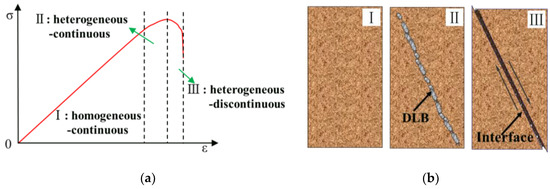 - (Heterogeneous–discontinuous stage): At this stage, the rock specimen is heterogeneous regarding its material properties and discontinuous as a rock structure. After the peak stress point, an interface gradually forms at the position of the DLB. Thereafter, the rock structure slides along the interface until the stress reduces rapidly and the specimen fails.