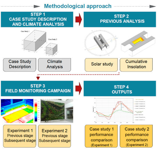 A methodological model to determine the influence of the different parameters on the courtyard microclimate was applied (Figure 1). Firstly, a detailed description of the selected case studies and a climate analysis of their location to determine the more suitable periods for field monitoring campaigns were achieved. Secondly, studies of sunlight conditions and radiation were performed. Afterwards, a field monitoring campaign with the previous and later state, after the application of the experiments, for both case studies was carried out. Additionally, finally, the experiments results were analyzed.