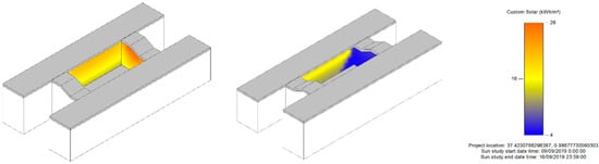 The results of the analysis, in terms of accumulated energy of a surface (kWh/m2), include direct radiation, diffuse radiation, radiation reflected from the ground, shading of surrounding objects, the portion of the sky “visible” by the surface and the angle of incidence between the sun and the face being analyzed [27]. As observed in Table 3, the accumulated solar radiation data for the two case studies analyzed revealed similar maximum and minimum values. This is explained by the similarity in orientation and AR values of both courtyards, despite corresponding to different sizes.