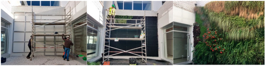 Experiment 2. Knowing the significance of vegetation as a key strategy in minimizing urban overheating, the second study consists of a modification of one of the facades’ surface coating of the courtyard in case study 2. For this purpose, a plant layer with drip irrigation was installed on the facade with the highest direct radiation from the sun as shown below (Figure 11). The vegetal system used was an optimal passive facade solution consisting of an industrialized and sustainable system that puts together different plants in the same module to be part of the constructive elements in the building’s facade. The vegetal facade was defined by several 100 cm × 100 cm modules (39.4 inches × 39.4 inches). Each module was constituted by several elements that are available in the market and do not require advanced technology: galvanized welded mesh and a plastic cell (replaceable by a metal box) with a substrate for the development of plants. The system includes a galvanized steel structure as a support frame.