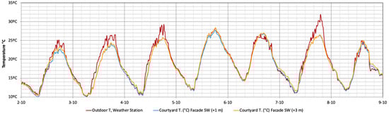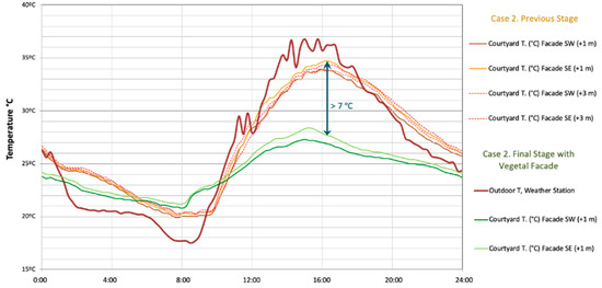 In case study 2, a vegetal facade was implemented in the south-west wall, being the facade that receives more hours of direct solar radiation. When the vegetal facade was installed, it substantially improved the TD regarding the outdoor temperature. While both facades presented no thermal difference before, after the adoption of the vegetation strategy, a difference up to 2 °C at some hours of the day is observed, despite the proximity between the facades (Figure 15). Moreover, the main objective being the thermal tempering of the microclimate generated by the courtyard is noticeable. The previous TD of 4 °C measured in the first stage (displayed in Figure 16) increased up to 11 °C with the installation of the vegetal façade, comparing a day with similar outdoor temperatures.