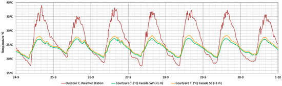 The courtyard thermal behavior in case 2 was better than in the previous case study, tempering better the outdoor temperatures, and achieving a TD up to 4 °C at the time of the maximum daily temperature (Figure 13). For a courtyard with an AR lower than 1, this is an adequate TD [3]. In this case, to be able to carry out the subsequent comparison, the results show the values measured on the south-west and south-east facing facades, with hardly any difference between the two. The low depth of the courtyard implies that there is hardly any thermal stratification inside, as in case study 1. In this case, the pavement was white gravel (albedo range close to 0.7), a less absorbent material than in case study 1.