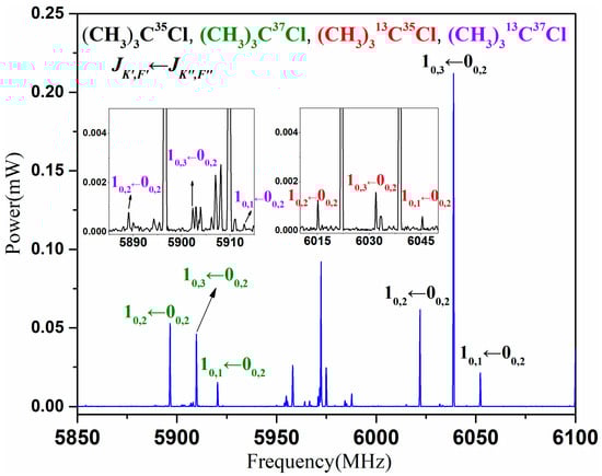 Tert-butyl chloride and its isotopologues are the main products of a chemical reaction between tert-butyl alcohol and hydrogen chloride. The products were formed by flowing a mixed carrier gas (0.5% HCl + 99.5% Ar/V) through a U-tube with tert-butyl alcohol (99%, purchased from Sigma-Aldrich) inside at room temperature. At 60 psi back pressure, the sample gas was supersonic expanded into the vacuum chamber through the solenoid valve nozzle (general valve series 9, diameter 0.9 mm) to bring the rotational temperature of the sample molecules down to 1–10 Kelvin, so as to optimize the molecular population on the rotational energy levels. The gas pulse frequency was 1 Hz, and the jet duration was 500 μs. After each injection, the oscilloscope collected 23 FID signals and cut them evenly and average, that was our newly developed broadband technology of multiple free induction decay. In the final spectrum, 10,000–20,000 FID signals were averaged to obtain better spectral signal-to-noise ratio compared with the previous work in []. Thus, rotational transitions of isotopologues (13C, 37Cl) could be detected in their natural abundance.