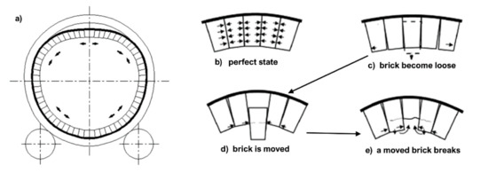 Inconsistency of geometrical parameters—in particular, the symmetry of the support rollers and the kiln shell along the longitudinal axis can result in permanent or temporary deformation of the shell (Figure 2a). As a result of this deformation, the inner refractory lining is damaged. When the kiln shell is deformed during its rotation, the kiln lining is loosened (Figure 2c) against the perfect state (Figure 2b), followed by a movement of a brick (Figure 2d), and finally breaking the lining of the kiln (Figure 2e). The damaged area of the shell without lining is prone to overheats and local damages of the kiln shell. Such a condition then requires a long-term overhaul [1].