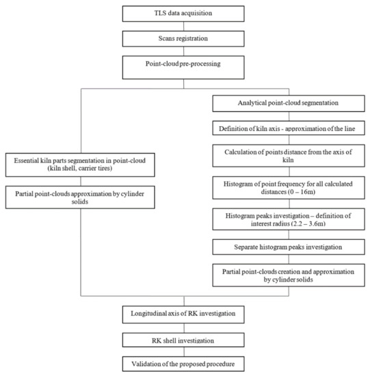 This research focused on determining a rotary kiln’s geometric parameters in a non-traditional geodetic way—by deriving them from a survey realized by a terrestrial laser scanner (TLS). The point cloud obtained by TLS measurement was processed to derive the longitudinal axis of the RK. Subsequently, the carrier tires’ geometric parameters and shell of the RK during the shutdown were derived. Manual point cloud selection (segmentation) is the base method for removing unnecessary points. This method is slow but precise and controllable. The proposed analytical solution is based on calculating the distance from each point to the RK’s nominal axis (local radius). Iteration using a histogram function was repeatedly applied to detect points with the same or similar radiuses. The most numerous intervals of points were selected and stored in separate files. In the comparison, we present the conformity of analytically and manually obtained files and derived geometric values of the RK-radiuses’ spatial parameters and coordinates of the carrier tires’ centers. The horizontal (X and Y directions) and vertical (Z-direction) of root–mean–square deviation (RMSD) values are up to 2 mm. RMSD of the fitting of cylinders is also up to 2 mm. The center of the carrier tires defines the longitudinal axis of the RK. Analytical segmentation of the points was repeated on the remaining point cloud for the selection of the points on the outer shell of the RK. Deformation analysis of the shell of the RK was performed using a cylinder with a nominal radius. Manually and analytically processed point clouds were investigated and mutually compared. The calculated RMSD value is up to 2 mm. Parallel cuts situated perpendicularly to the axis of the RK were created. Analysis of ovality (flattening) of the shell was performed. Additionally, we also present the effect of gradually decreasing density (number) of points on the carrier tires for their center derivation.