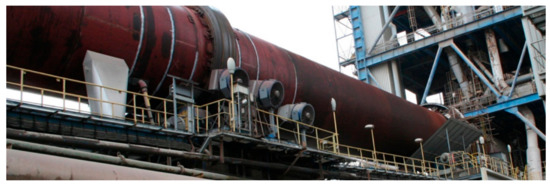 Rotary kiln (RK) is large‑scale machinery operating under conditions of high temperature (about 1200 °C) and rapidly changing mechanical stress. RK is used mainly for metallurgical purposes when drying, roasting, sintering loose raw materials, and burning of limestone, bauxite, and sulfur. The material passes through a slightly inclined (in some cases horizontal) rotating cylindrical shell of the kiln with refractory brick lining. The length of the RK is usually between 40 and 200 m, with a cylinder diameter of 2–6 m. The weight of the kiln is up to several hundred tons, depending on its length. The slope of the furnace is usually between 0% and 6%. The outer temperature of the shell during operation reaches up to 450 °C. The speed of the steady rotation is 1 to 1.5 rpm.