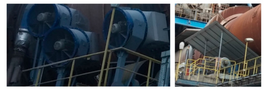 During the surveying time, some obstacles to measuring the entire rotary kiln shell were detected, the permanent ones were, e.g., fans, pipelines, heat and dust deflection shields, and safety shields (Figure 7). Due to the RK’s ongoing reconstruction, a work construction platform was placed at the outlet part of the RK.