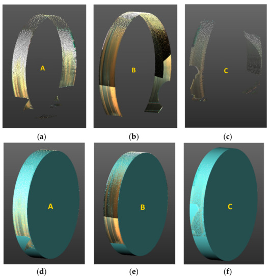 Point clouds (a–c) and cylinders (d–f) fitted on tires of the rotary kiln (RK) (tires A, B, C).