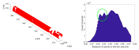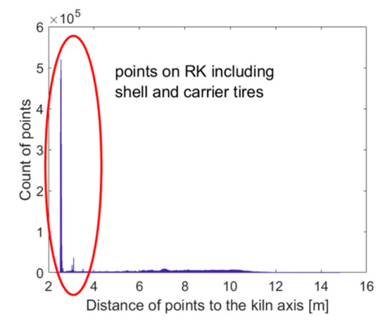 For every point in the point cloud, the distance to the real kiln axis was calculated. The whole raw point cloud contained about 20 million points, including unnecessary points on a distant object. The manually cut point cloud, which contained 6,422,263 points (Figure 11) on RK and its periphery, was processed by MatLab software. As a result, the perpendicular distances of each point to the kiln axis were obtained. The histogram function was repeatedly applied to count the number of points in each interval. The peaks of the function were traced and reviewed. Separate data files for the partial point clouds were created for every investigated peak.
