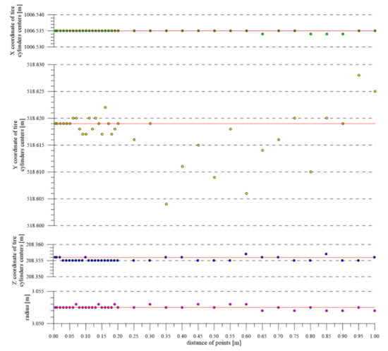 The centers of the fitted tire cylinders define the longitudinal axis of the RK. The conformity of the fitted cylinder center’s derivation coordinates between the results of manual point cloud selection and an analytical solution is shown in Table 2.