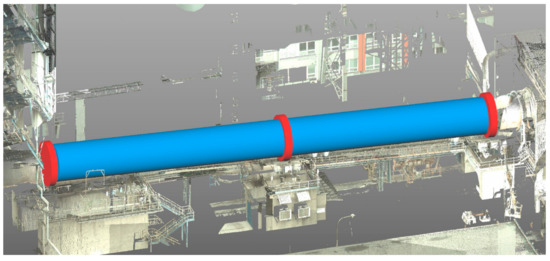 The TLS survey was realized for the rotary kiln in a cement plant near Košice, Slovakia (Figure 4). The kiln is approximately 80 m long, the theoretical inclination of the longitudinal axis is 3.5%, the diameter is 5000 m. The rotary kiln is placed above the ground on three separate foundations. The propulsion with the gearbox is located in the first basement. The transmission of rotary force is provided by a gear tire engaged with the pinion of the gearbox. An axial roller guarantees the stability of the RK in the longitudinal direction on the first basement. This RK is on duty for more than 45 years.