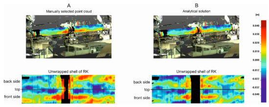 The graphical representation of the deformation of the RK shell based on (A)—manually selected point cloud and (B)—analytical solution; displayed in a 3D view and as an unwrapped shell of the RK.