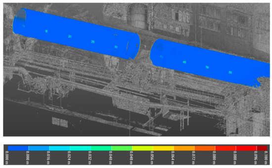 The accuracy of TS measurements results from the accuracy analysis according to Equations (2) and (3). Therefore, it can be considered as a reference and control methods of measurement for our new approach. The accuracy of the reference methods meets technical standards requirements—for example [56,57], local methodological guidelines, and the practical approach according to, for example, [31,32,33,34,35,36]. The TLS data’s direct control consisted of measuring 203 points on the kiln shell, approximately in its middle part. Then, the distances of the measured TS points to the point cloud obtained by TLS were compared. RMSD determined in CloudCompare software has a value of 2 mm, which we consider a successful control of measurement’s selected technology.