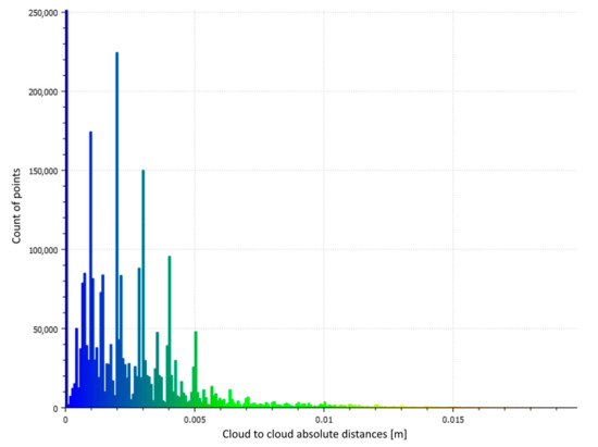 Distribution of the deviations between point clouds in interval up to 15 mm.