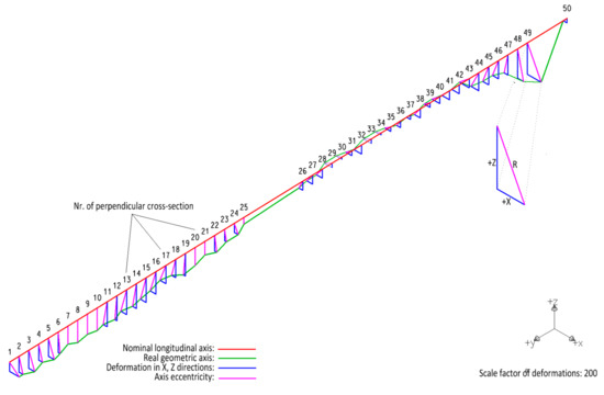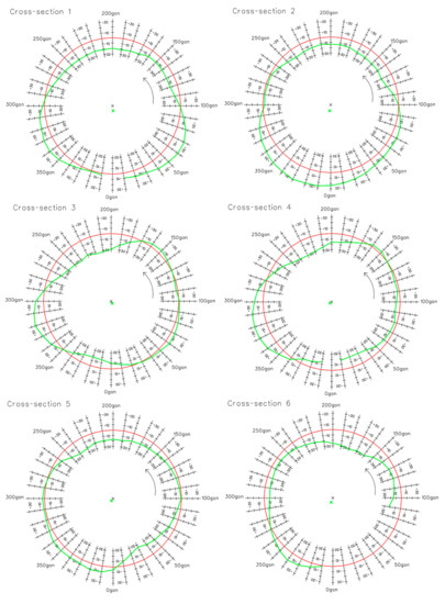 To determine the RK’s ovality, graphs corresponding to the cross-sections of the kiln shell were created. The interval between sections was set to 1 m. Fifty cross-sections in stationing were generated, where it was possible to make a complete cross-section from the point cloud. The selected graphs are shown in Figure 31. The red circle represents the nominal cylinder; the green curve represents the RK shell’s real surface in this cross-section. The results of the analytical segmentation are shown. Differences are triply amplified. The nominal and real centers of the RK shell are also specified and showed. By combining multiple cuts, the whole RK’s real longitudinal axis can be investigated in longitudinal section form (Figure 32). The results of determining the minimum and maximum radius of the shell and the calculated values of ovality ω0 on the selected six cross-sections are given in Table 5. It also shows the deviations of the kiln shell’s actual center from the theoretical axis in the transverse direction and in height.
