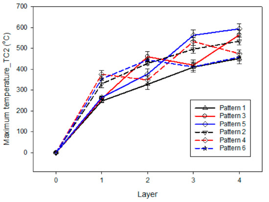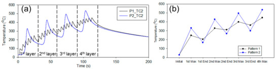 - The peak temperature of each layer can increase or even decrease according to the sequence of the deposition pattern. This experimental result can be the evidence that appropriate design of the deposition pattern for each layer can be utilized to control the maximum temperature of the AM parts.