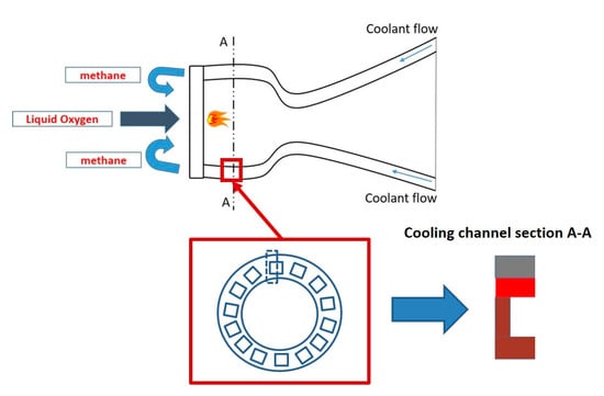 - Ferraiuolo, M.; Ricci, D.; Battista, F.; Roncioni, P.; Salvatore, V. Thermo-structural and thermo-fluid dynamics analyses supporting the design of the cooling system of a methane liquid rocket engine. In ASME International Mechanical Engineering Congress and Exposition; American Society of Mechanical Engineers: Montreal, QC, Canada, 2014. [Google Scholar] [CrossRef]