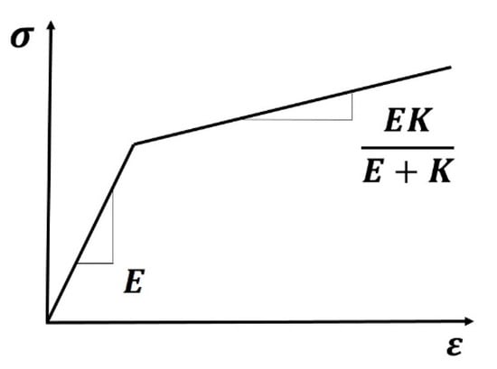 For a one–dimensional plasticity model, the stress–strain relations, when considering a bilinear kinematic hardening model (see also Figure 2), are expressed as: