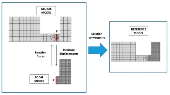 Generally, two separate finite element analyses on two separate models are conducted: a Global linear model with a coarse mesh and a Local nonlinear model with a fine mesh. A one-way approach is taken, where the displacements at the interface between the Global and Local models, evaluated by a finite element linear analysis of the Global model, are transferred to the Local nonlinear model as boundary conditions. Generally, in such an approach the Global model results affect the Local model analysis and not vice versa [], but Gendre et al. proposed a two-way approach with the aim to improve the level of accuracy of the numerical results []. In the latter approach, the results of the Local model, in terms of nodal forces at the boundaries with the Global model, are subtracted from the nodal forces evaluated by means of the Global analysis and then applied as extra boundary conditions in the subsequent Global analyses. After a few iterations, the forces to apply at the boundary tend to zero; this means that convergence has been reached, as also demonstrated by a comparison with the results of a FEM Reference model. For the latter model, the mesh in the submodelled area exactly reproduces the mesh of the Local model, whereas the remainder of the domain reproduces that of the Global coarse model.