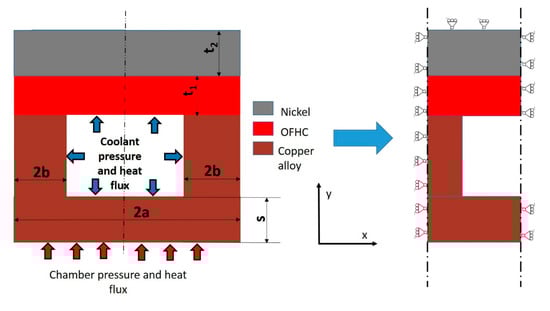 The present study focus on the final Demonstrator, a regeneratively cooled thrust chamber. The Demonstrator comprises an inner structure made of a copper alloy (CuCrZr), and an external cold structure made of electrodeposited nickel (Figure 1). Carrying out a thermomechanical analysis of the cooling channel can be very demanding from a computational point of view, since nonlinear phenomena, such as plasticity, and time-dependent phenomena (e.g., creep) can come into play [,,,,,]. Consequently, there is a strong need to adopt simplified models or, in turn, numerical procedures that can save computation time.