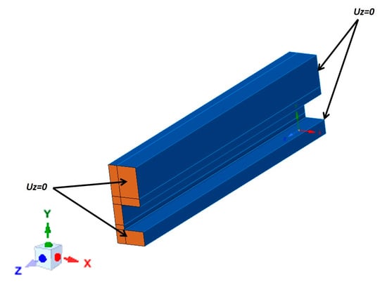 - One-way coupling between the thermal and the structural problem, namely, the temperature field, evaluated by the thermal analysis, is applied as body loads for the structural nonlinear analysis. On the other hand, since for this kind of problem the displacement/strain field does not have a significant impact on the temperature field, as demonstrated in several works [], the thermal analysis is not repeated.