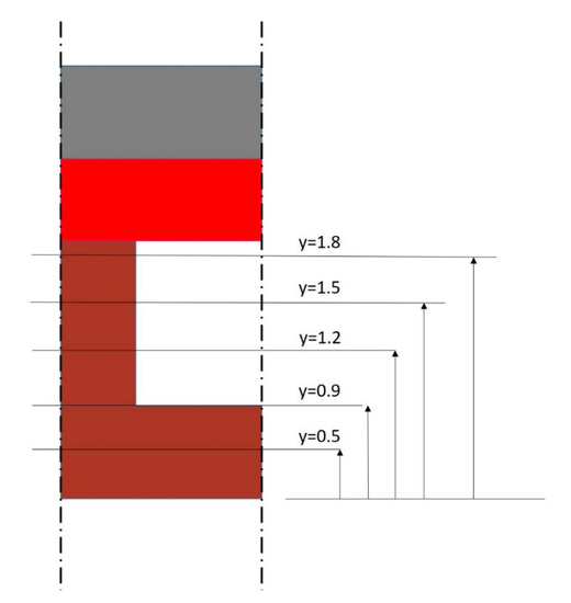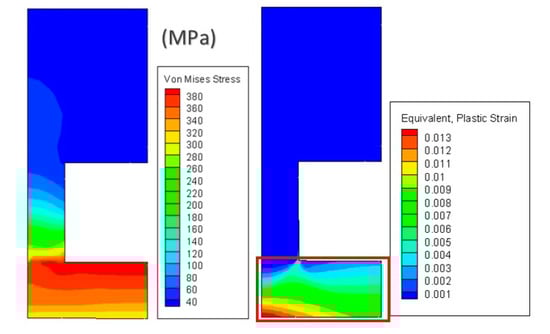 The yield criterion defines the limit of elasticity, namely, it delimits the surface that separates the elastic stress field, inside the yield surface, from the plastic stress field which lies outside the yield surface []. Plastic strains will be detected when the equivalent stress equals the yield value . The yield surface can be expressed as follows:
