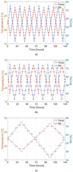 Triangular temperature and RH variations, (a) Triangular 12/12 h; (b) Triangular 8/16 h; (c) Triangular 72/72.