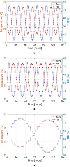 Sinusoidal temperature and RH fluctuations, (a) Sinusoidal 12/12 h; (b) Sinusoidal 8/16 h; (c) Sinusoidal 72/72.