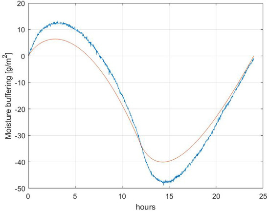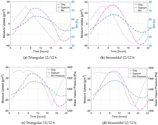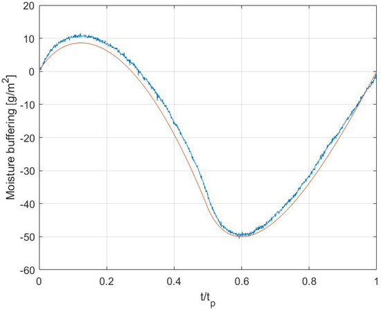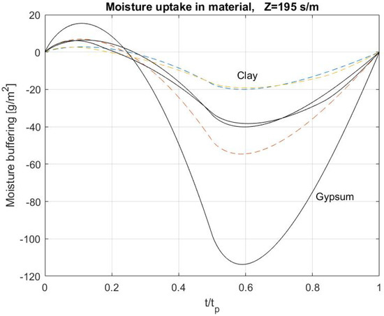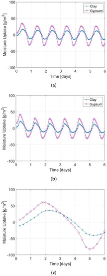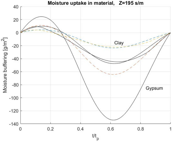 The only material specific part of Equation (39) that gives the amplitude of the moisture uptake is the vapour effusivity . By applying the same environmental variations to clay and gypsum by doubling , the moisture uptake doubled. On fact, it can be observed that the ratio between the case of gypsum and clay is constant for the same load profile, following the ratio of the effusivity. The measurement give the ratio 0.45 to 0.53 while the simulations 0.48–0.49 for all cases. The variations in the simulation values are due to the small variations in .