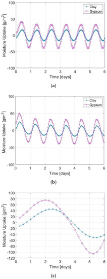 Moisture uptake curves for clay and gypsum under sinusoidal temperature and RH fluctuations, (a) Sinusoidal 12/12 h; (b) Sinusoidal 8/16 h; (c) Sinusoidal 72/72.