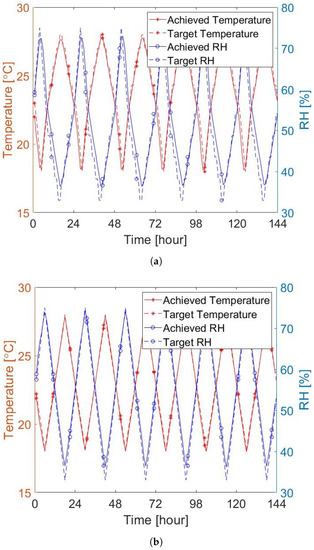 Monitored temperature and RH into the chamber the triangular tests, (a) Triangular 8/16 h; (b) Triangular 12/12 h.