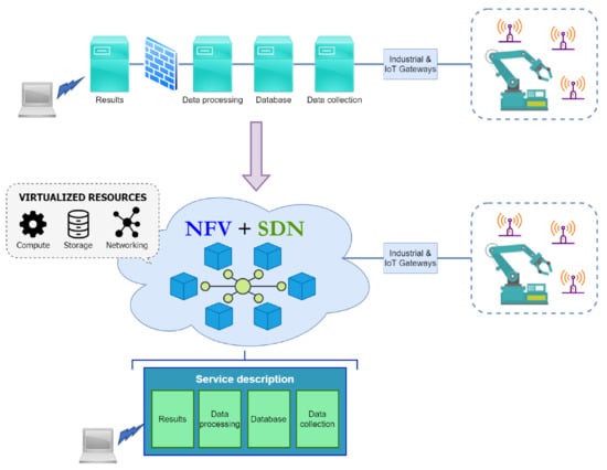 Two of these technologies that are additionally concerned with this article are Network Functions Virtualization (NFV) and Software-Defined Networking (SDN), both of which are considered key enablers of the fifth generation of mobile networks (5G) to achieve a flexible and agile network platform over which to deploy heterogeneous services [,]. These technologies represent an evolution towards the softwarization and virtualization of the network infrastructure and the network functions. The integration of NFV and SDN in the manufacturing industry (Figure 1) can greatly simplify the design and deployment cycle of new and innovative manufacturing services while achieving better utilization of computing and networking physical resources.